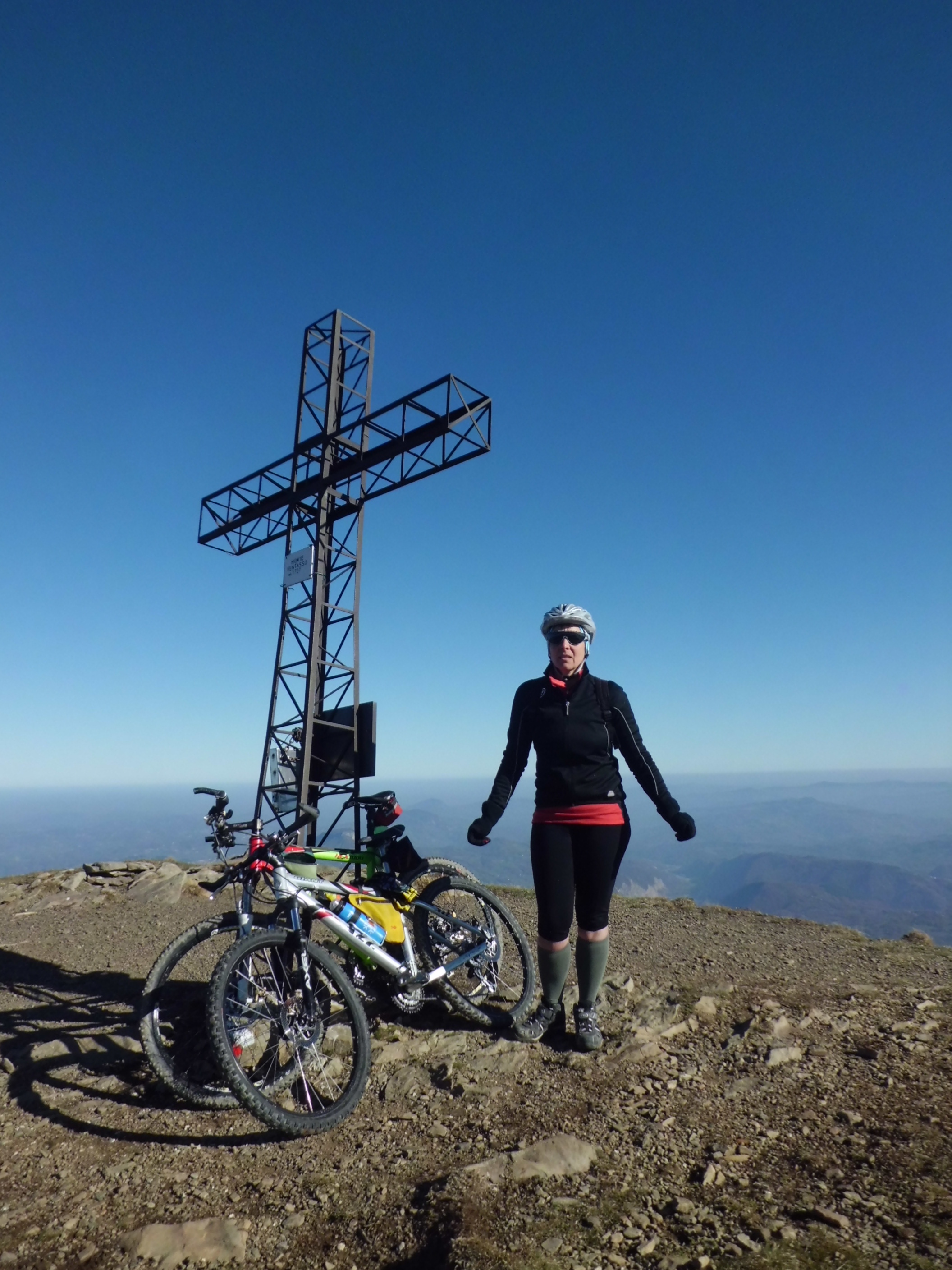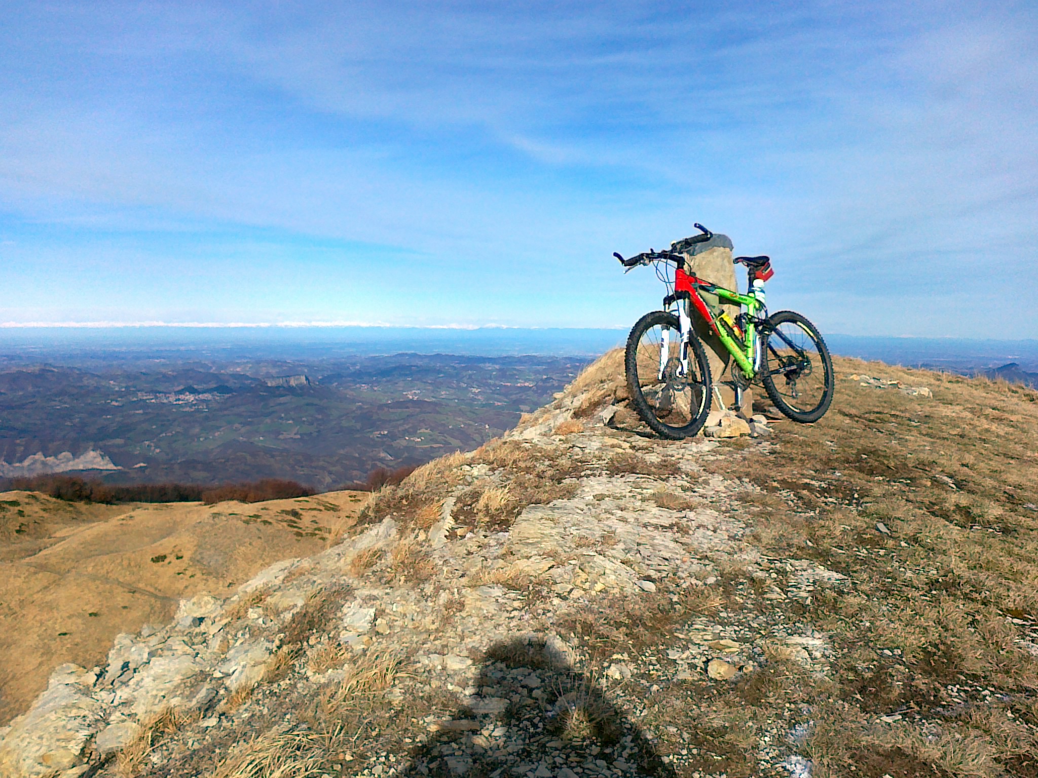 Il sentiero che dalla Scalucchia sale verso il Casarola è ciclabile e piacevole per un bel tratto: alcuni strappi a spinta, qualche contropendenza fino a che si impenna e sale sulla cresta. Non rimane che salire con pazienza e la bici in spalla. La brina è poca e si cammina con sicurezza; l’ultimo strappo ripido sotto alla cima con alcuni passi che richiedono prudenza.